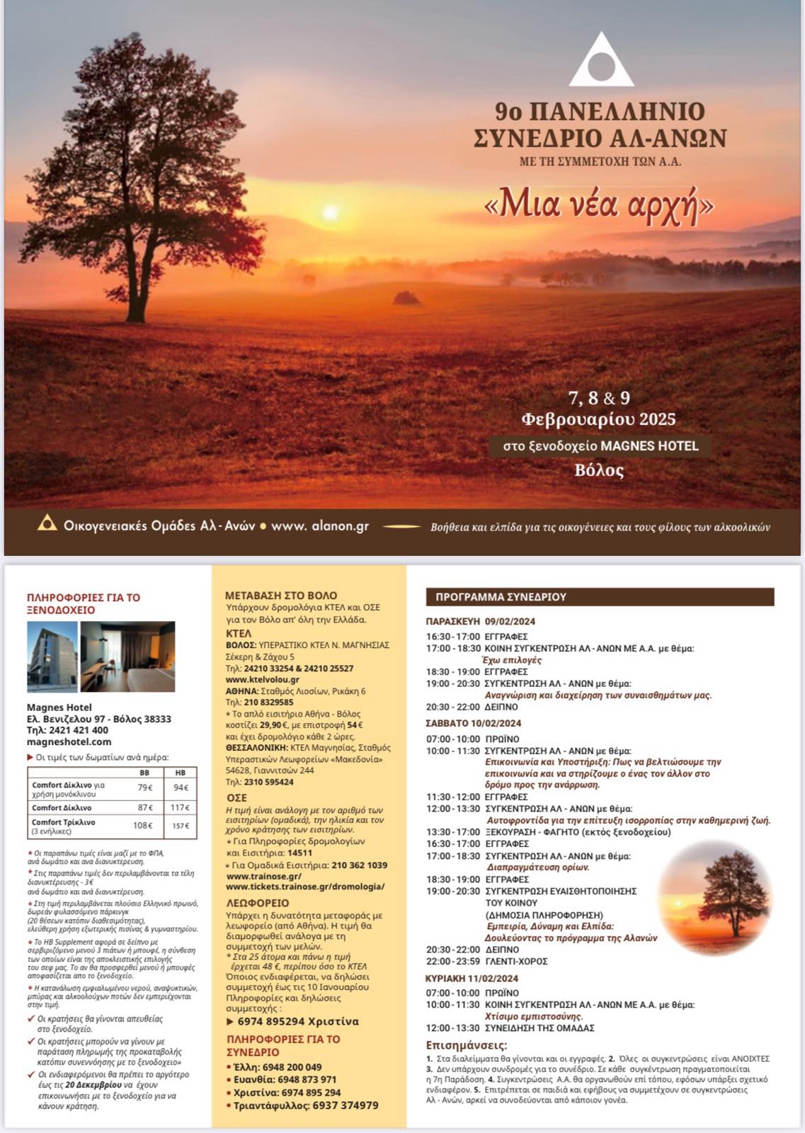 With AA participation Porto Heli 16-18 May 2025 9th Greek Al-Ánon Convention (with AA participation) Volos 7-9 February 2025 20th Greek AA Convention (with Al-Anon participation) Kamena Vourla 11-13 October 2024 8th Corfu Al-Ánon & Alateen Convention (with AA participation) Messonghi, Corfu 20-22 September 2024 ---------------------------------------------- Return to upcoming Conventions |